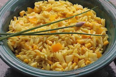 I've made a few courgette recipes, so will share them later, but today its Turmeric Lemon and Courgette Orzo. Its not much of a recipe, as I eye-balled everything. I began with 250g orzo pasta and 1/2 teaspoon ground turmeric to the rolling boiling water. The ochre yellow turmeric dyes the rice shaped orzo pasta whilst cooking.
