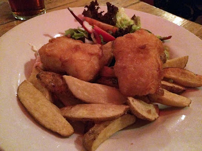 We both had the Vegetarian Halloumi 'Fish' and Chunky Wedge chips with salad and mushy peas.