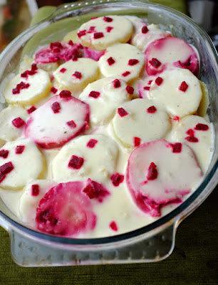 In a 12inch gratin dish, arrange the beetroot first followed the potatoes and continue this until all used up. Then pour over the sauce.