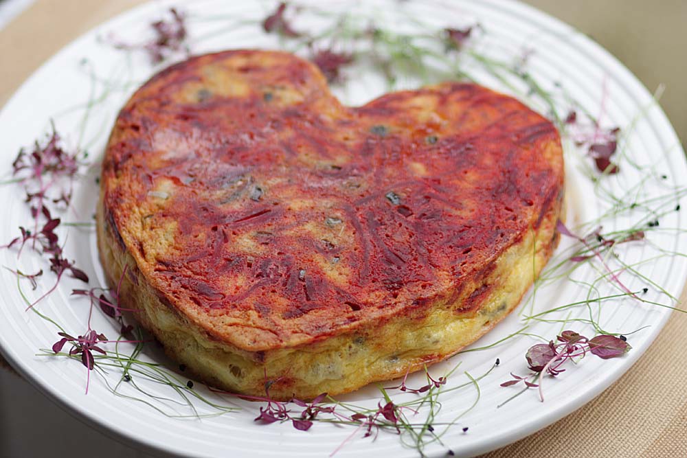 I've made Persian Kuku many times before, for those of you unfamiliar with it - click on this link to learn more. Kuku's are a Persian omelette and what I present to you is not exactly one - though it did start of originally as a Kuku . I should have made it in a wide frying pan, but I wanted to get all fancy for Valentines day and made it in a silicone heart shaped mould.