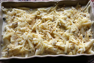 Stir the cooked pasta into the sauce and season to taste with salt and pepper. Then stir in all but 2 tablespoons of the cheddar cheese. Then evenly spoon the pasta mixture on top of the tomato-lentil layer.