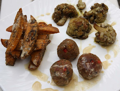 Za'atar Cauliflower, Sweet Potato Wedges with vegan Coriander 'Meatballs' drizzled with Lemon Tahini sauce and some light greens (not shown).