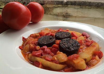 Ramiro Pepper and Harissa Tomato Potatoes with Black Pudding