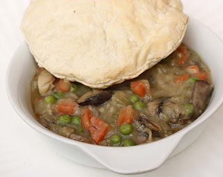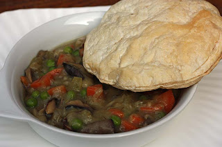 Heat the oil in a wide pan over medium-high heat. Saute the onions until transluscent, then stir in the celery, carrots, thyme, salt and pepper. Cook, stirring occasionally, until the vegetables are beginning to soften about 10 - 15 minutes. Then stir in the mushroom and saute. Add the flour and cook, stirring to prevent it from sticking for 30 seconds or so. Pour in the vegetable stock and peas, bring to a boil and simmer for a few minuted. Turn off heat and transfer the vegetable mixture into ovenproof dishes or an 8-10 inch square baking dish. Lay the pastry circles on top. Bake until the puff pastry is puffed and golden - about 25 to 30 minutes.Bookmarked and adapted Mushroom Pot Pie recipe from Real Simple: Life Made Easier website.